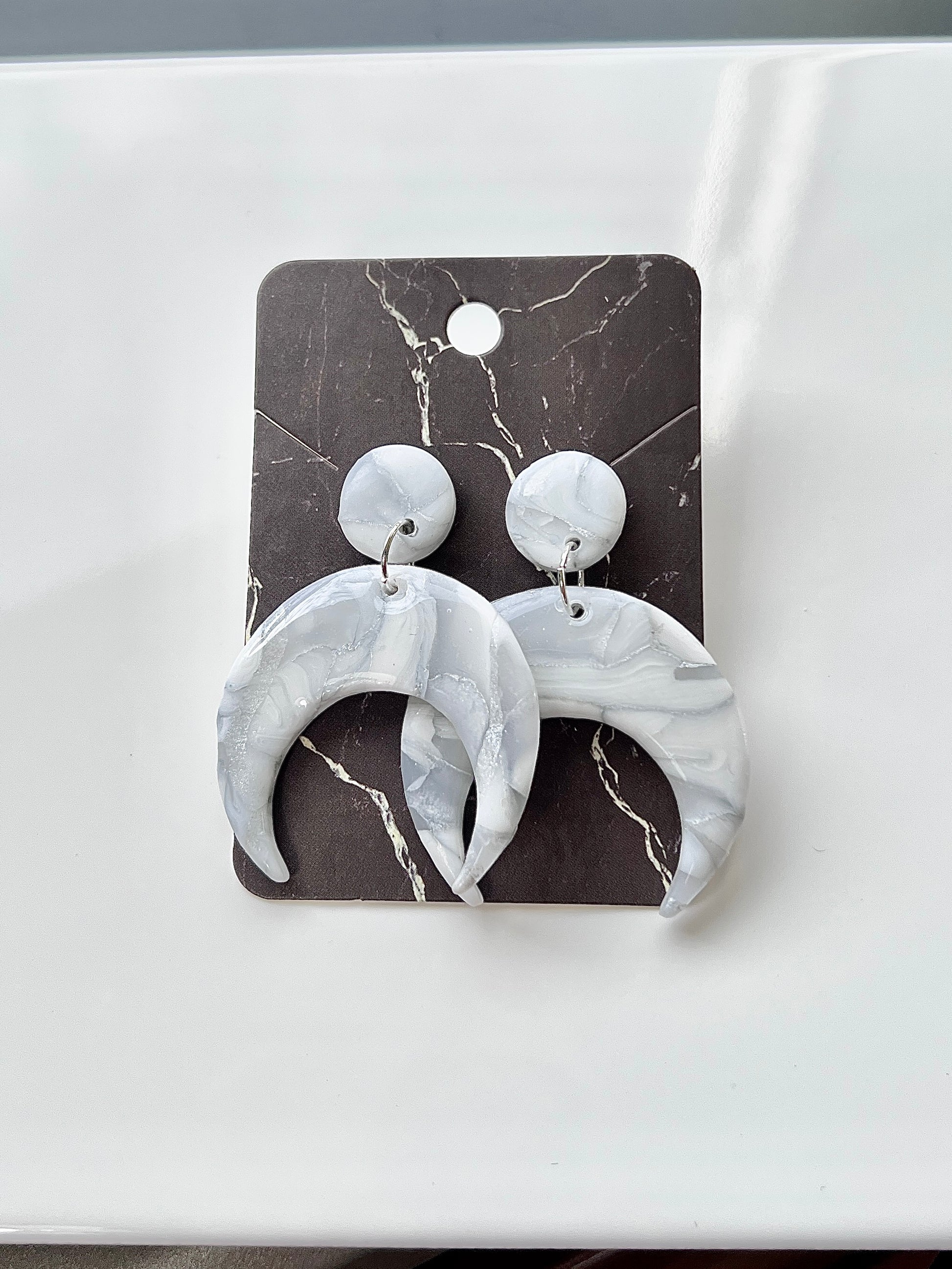 Marble Moons are statement earrings crafted from lightweight polymer clay with a durable resin coating. These unique crescent-shaped earrings feature a marble-inspired design, and are secured with stainless steel posts. Perfect for adding a hint of drama to any look.